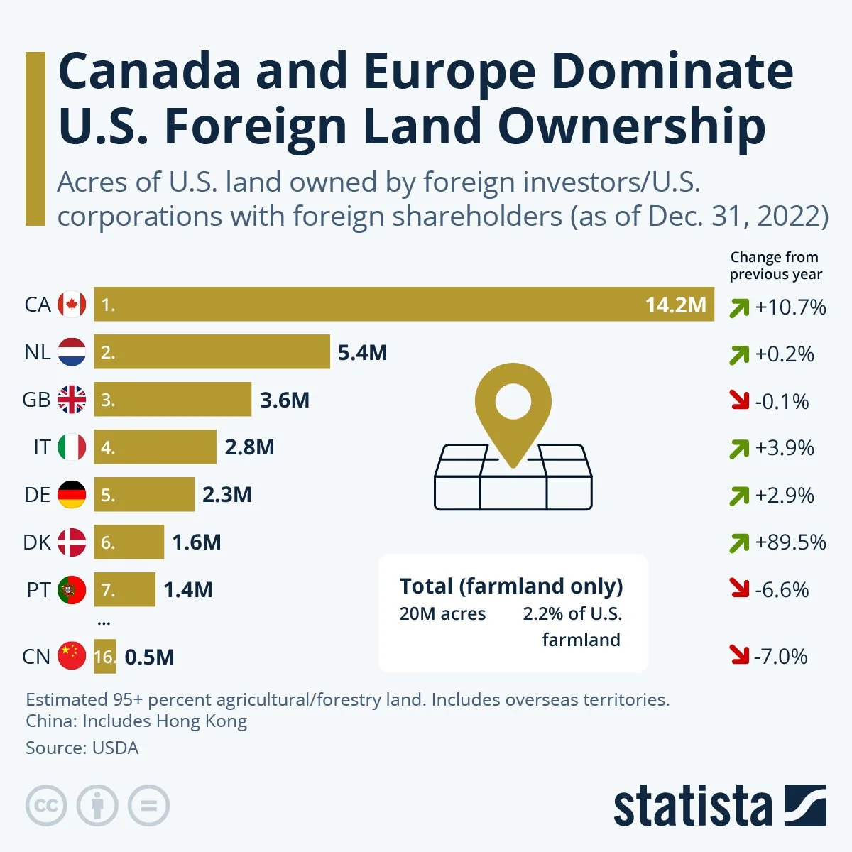 There have been several headlines over the past few years about foreigners, China in particular, buying up land in the U.S. This week's chart provides a look at foreign land ownership; with China ranking #16, far behind Canada and even the Cayman Islands. Diving a bit deeper, only 2.2% of US farmland is foreign-owned.