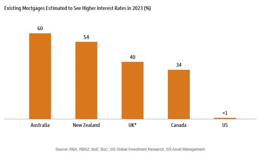 Mortgage rates have risen sharply in response to aggressive interest rate hikes; however, the US appears to be better insulated from mortgage payment shocks in 2023, when compared to other countries, primarily because of the popularity of variable rate mortgages abroad. Goldman Sach's Global Investment Research team expects that less than 1% of US mortgages will face higher interest rate payments in 2023, while over half of mortgages in Australia and New Zealand will face higher rates.