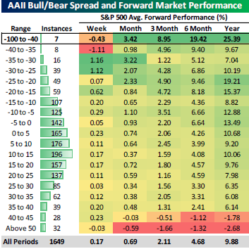 This chart shows the average forward market performance of the S&P 500 1 month, 3 months, 6 months, and 1 year after various ranges of market sentiment. Historically when investor sentiment has been this bearish, (Bull/Bear spread sentiment indicator at -60) forward returns going out one month to one year have been very positive. Despite the headlines, market bottoms are typically formed in times like this when no one can find anything positive on the horizon.