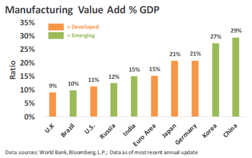 Elevated global trade tensions, particularly between the U.S. and China, have led to significant weakness across the global manufacturing sector since early-2018. Thankfully, most global service sector gauges remain in expansionary territory, with the U.S. Services Purchasing Manufacturer’s Index coming in at 56.4 for August. It is important to remember that the U.S. economy is a consumer based economy and manufacturing comprises a relatively small share of overall U.S. GDP as shown in the chart below.