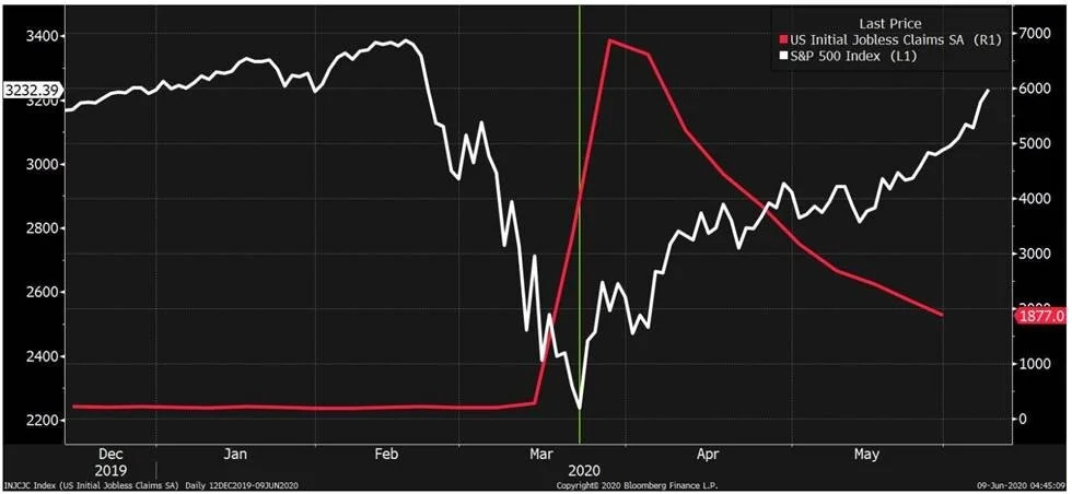 The stock market doesn’t need conditions to go from bad to great. Rather, it just needs to see an improvement in conditions. As the economy begins to heal, stocks have rebounded. You can see this clearly looking at a chart of the S&P 500 (white line) vs. initial jobless claims (red line). The stock market bottomed right as the pace of layoffs hit their most intense level, and has been rebounding alongside an ongoing decline in weekly job losses. While jobless claims are only one economic indicator, it does indicate conditions have started to improve.